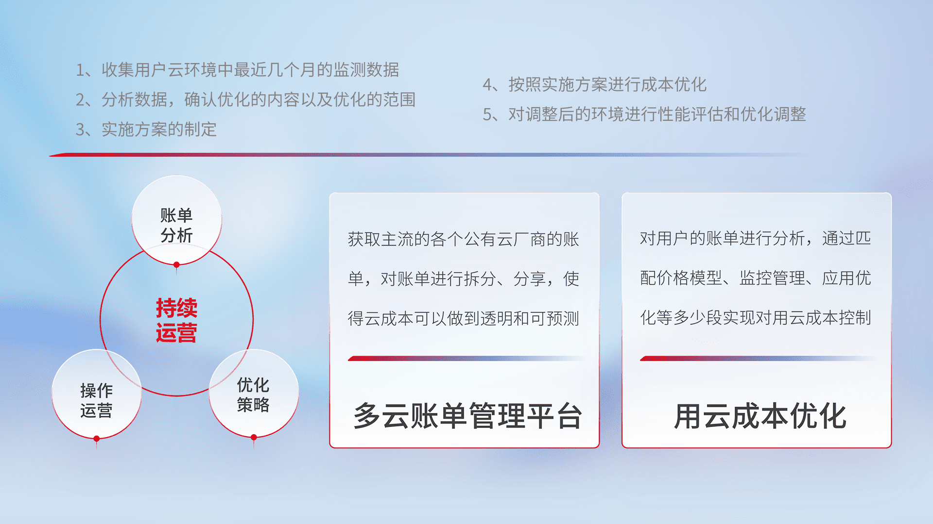 通过多云纳管,,,,以统一的资源数据模型把客户的云资源进行抽象和封装,,,进而实现对多云资源的统一操作,,保障云资源管理的可靠性、、稳定性与可用性。。。量身定制化运维内容,,,配置、、、、开发运维、、、、补丁管理、、、、备份、、监控、、、、认证和访问管理、、审计和日常巡检等,,保障在用云过程中的可靠度,,,,稳定度以及高可用率。。。。